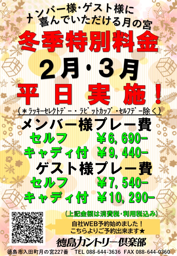 【メンバー様・ゲスト様】冬季平日特別料金(2月・3月)のご案内